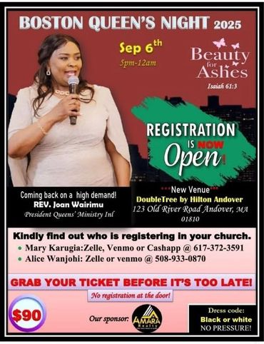 Welcome to Boston Queen's night 2025! A night of power, purpose, and transformation awaits you! No matter your age (16 and above), no matter your background, no matter your current season. YOU ARE INVITED. Whether you walk in with a crown visible or invisible, you are a queen, and this night is for YOU to rise, to heal, to worship, and to walk boldly in your God-given identity